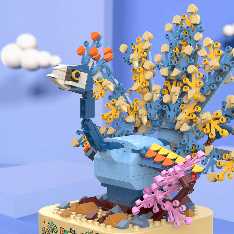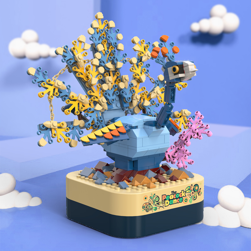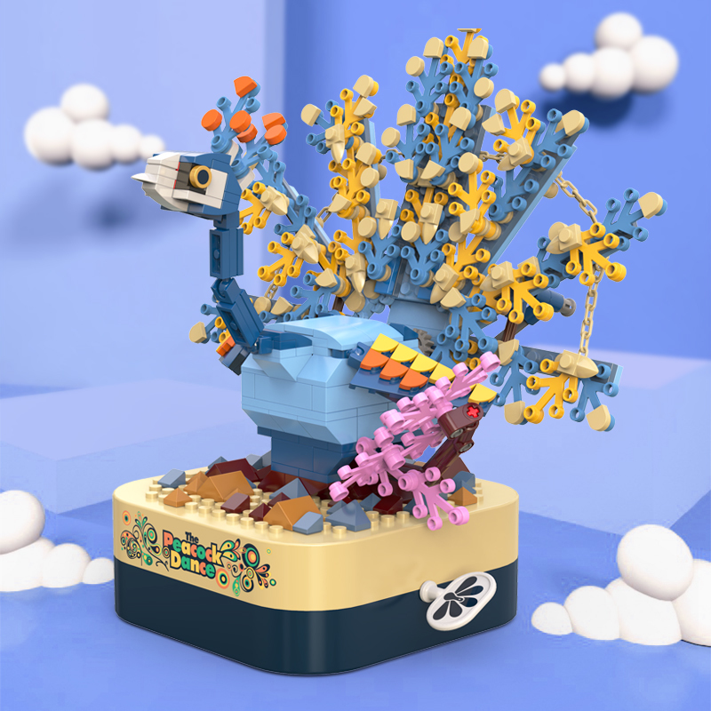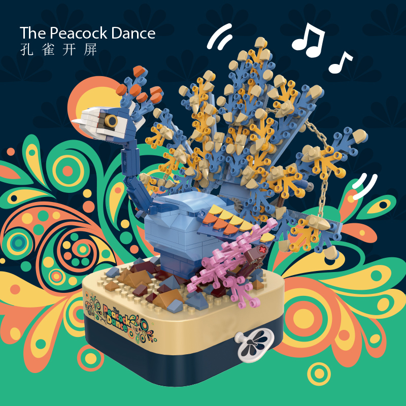 將積木與音樂盒完美結合,好玩又時尚。純機械動力設計更環保,音樂盒發條轉動帶動孔雀展開羽毛,益智拼搭,時尚美觀,還能充當家居精品擺件。